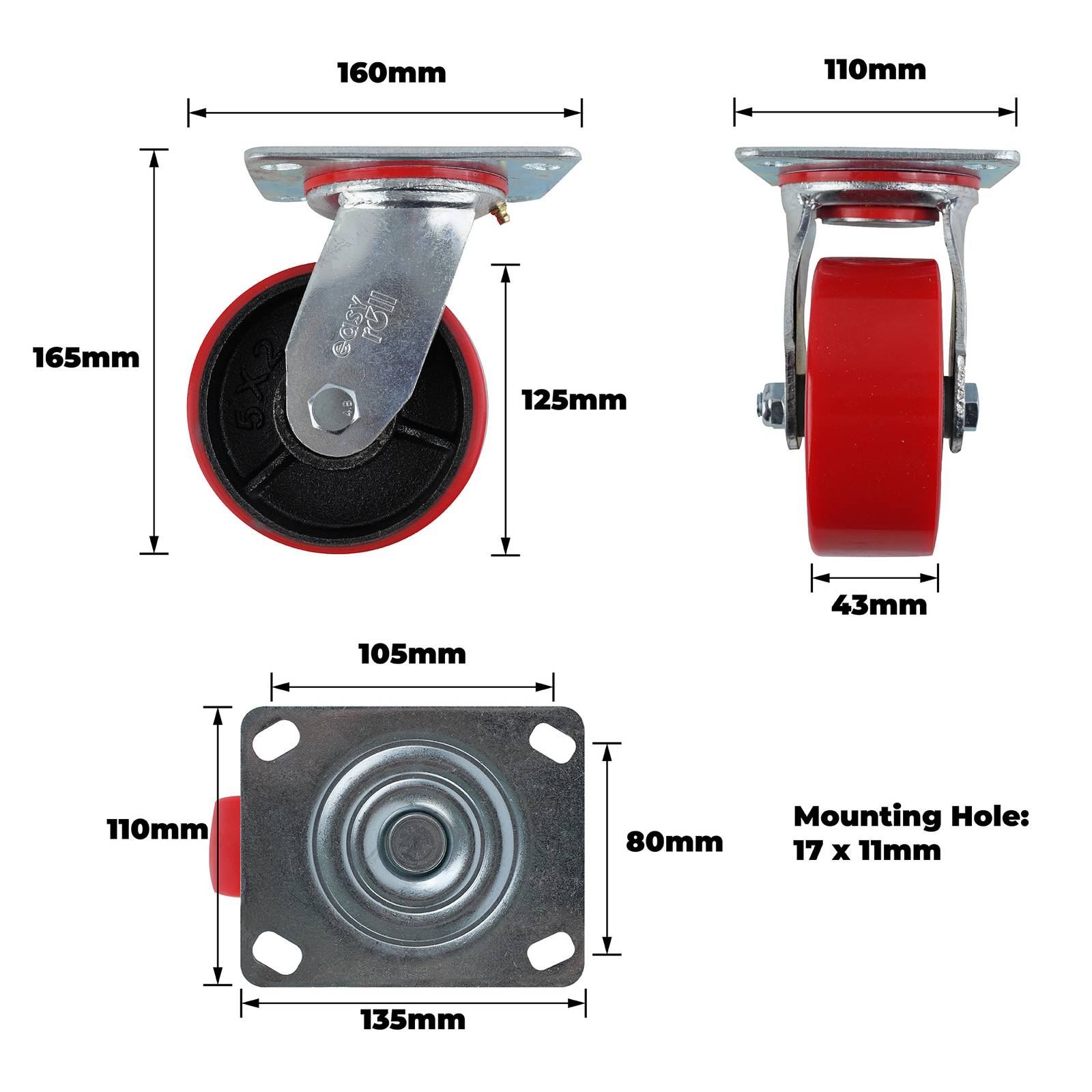 125MM RED URETHANE/CI SWIVEL PLATE CASTOR
