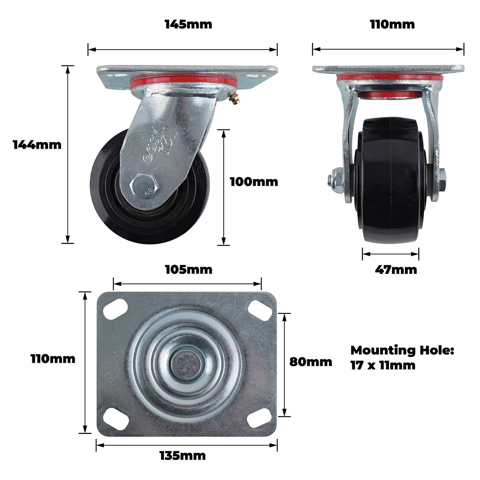 100MM BLACK NYLON SWIVEL PLATE CASTOR is a robust swivel castor designed for DIY projects and commercial applications. Its precision bearing mechanism and durable construction using steel and polyurethane ensure reliable performance with a load capacity of 320 kgs. Ideal for workshops, retail fixtures, and home furniture, this castor delivers smooth movement and stability, making it a practical choice for those who demand quality and performance in technical designs.Detailed
