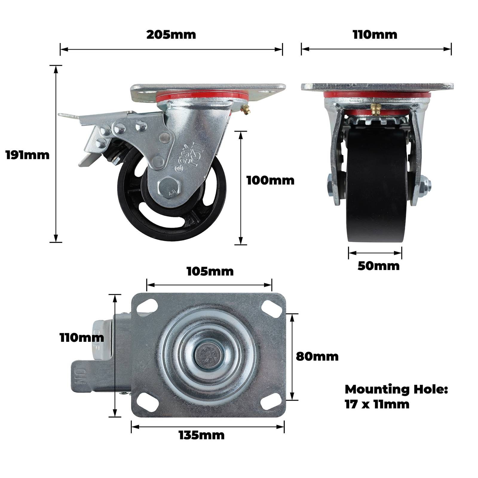 100MM Cast Iron Swivel Plate Brake Castor is engineered for demanding DIY and industrial applications. Built entirely from steel, this swivel brake castor features precision carbon steel bearings that deliver reliable performance and robust durability. Its single raceway design allows for smooth manoeuvring while safely controlling heavy loads up to 320 kg. Ideal for projects requiring exact movement control, it offers a practical solution to stabilise equipment and enhance operational safety.Detailed
