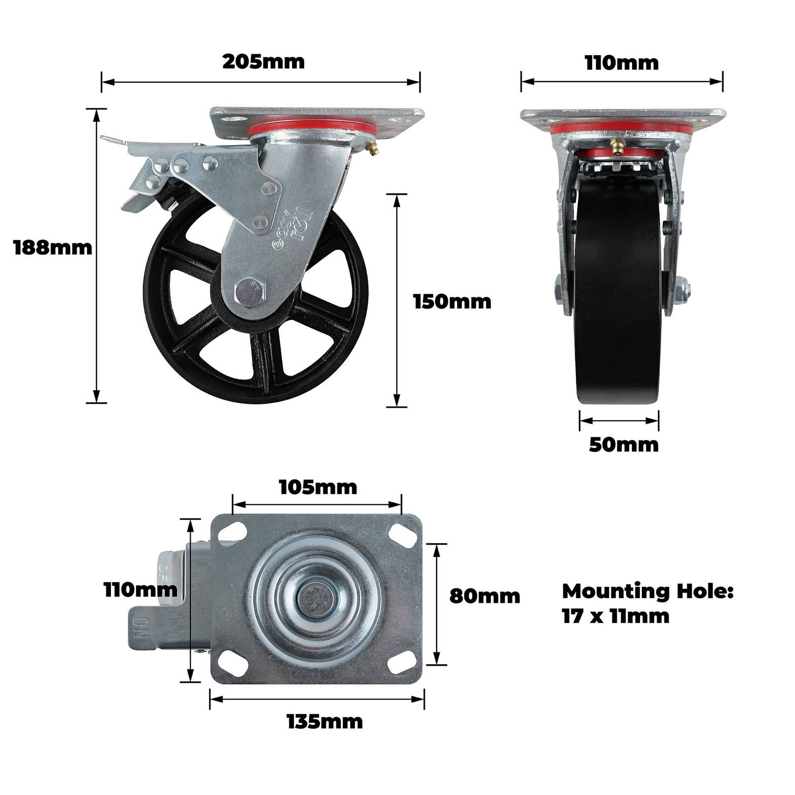 200MM CAST IRON SWIVEL PLATE BRAKE CASTOR 600