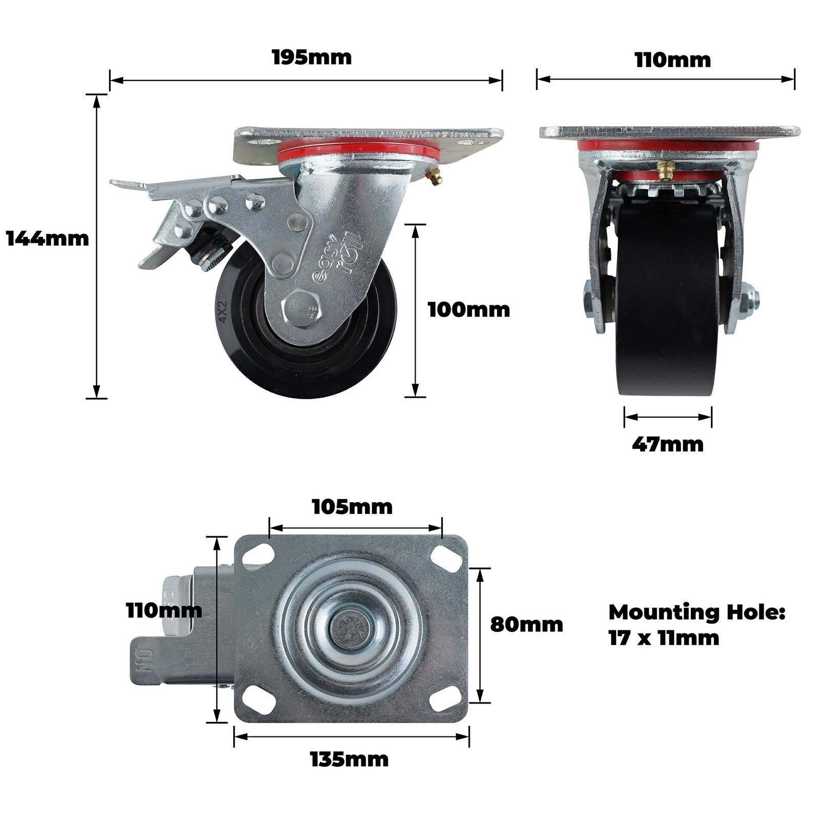 100MM BLACK NYLON SWIVEL PLATE BRAKE CASTOR is a robust and reliable component designed for DIY enthusiasts who require precise and durable mobility solutions. This swivel brake castor features a precision bearing and a single raceway design, ensuring smooth and controlled movement. The combination of steel housing with black nylon and polyamide components makes it well-suited for various applications, offering excellent load capacity and technical advantages for both retail and online buyers who value quality and precision.Detailed