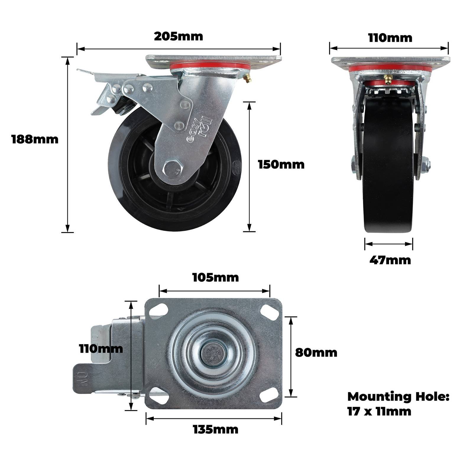 150MM BLACK NYLON SWIVEL PLATE BRAKE CASTOR