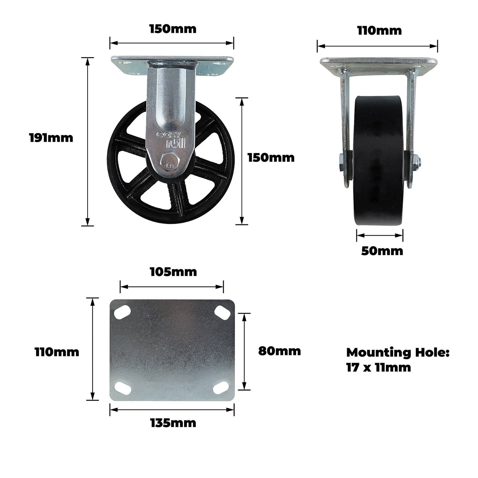 150MM CAST IRON FIXED PLATE CASTOR is engineered for DIY enthusiasts and professionals who require robust, dependable mobility solutions. This fixed castor utilises precision bearings and a polyurethane wheel for smooth operation and impressive durability. Its cast iron structure and steel components are designed to withstand heavy loads up to 410 kg, making it ideal for industrial and retail applications where reliable performance and practical ease of use are essential.Detailed