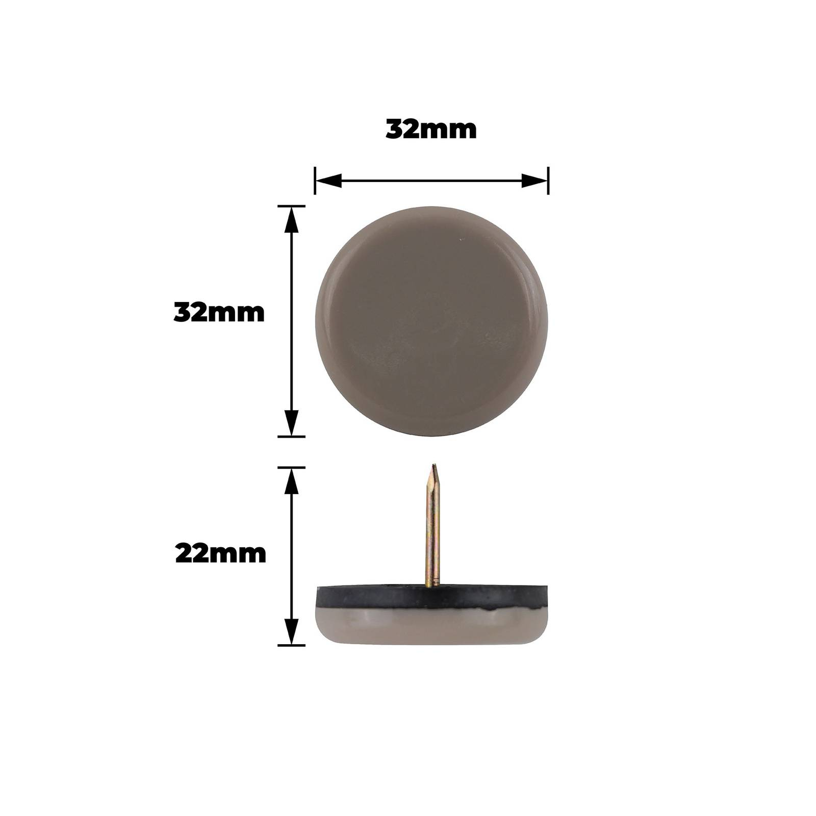 SG 32MM ROUND SLIDE GLIDES NAIL ON is a robust nail on slide designed for DIY enthusiasts seeking reliable, high-performance components for furniture, cabinetry and general construction projects. Comprised of thermoplastic rubber, polyethylene and stainless steel, its round design in grey ensures smooth, enduring movement and stability. With ease of nail on installation, this durable slide glides offer a practical, cost-effective solution for repair or new assembly tasks.Detailed