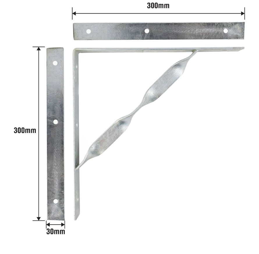 a heavy-duty twisted stayed bracket designed for robust DIY applications. Constructed from quality steel with a hot dipped galvanised finish, this component reliably supports loads up to 300 kgs, making it ideal for structural projects and custom installations. Its engineered design provides stability and durability that technical users require for demanding building and repair tasks, ensuring practical and secure performance in various projects.Detailed