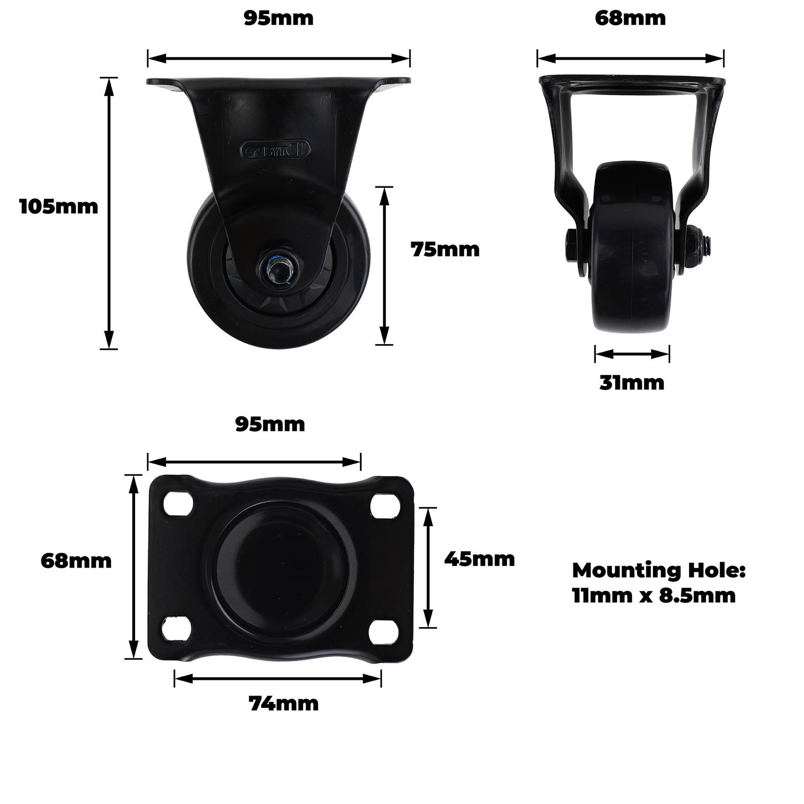 Brand: easyroll 75MM BLACK PVC WITH PP CORE FIXED CASTER BLAC is a precision-engineered fixed caster designed for DIY projects demanding dependable load support and smooth mobility. The durable caster features a robust steel housing, carbon steel bearings and a polypropylene wheel core paired with a polyvinyl chloride tyre. Suitable for both domestic and industrial applications, this caster is engineered to withstand loads up to 80kgs, making it an essential component for reliable, practical solutions.Detailed