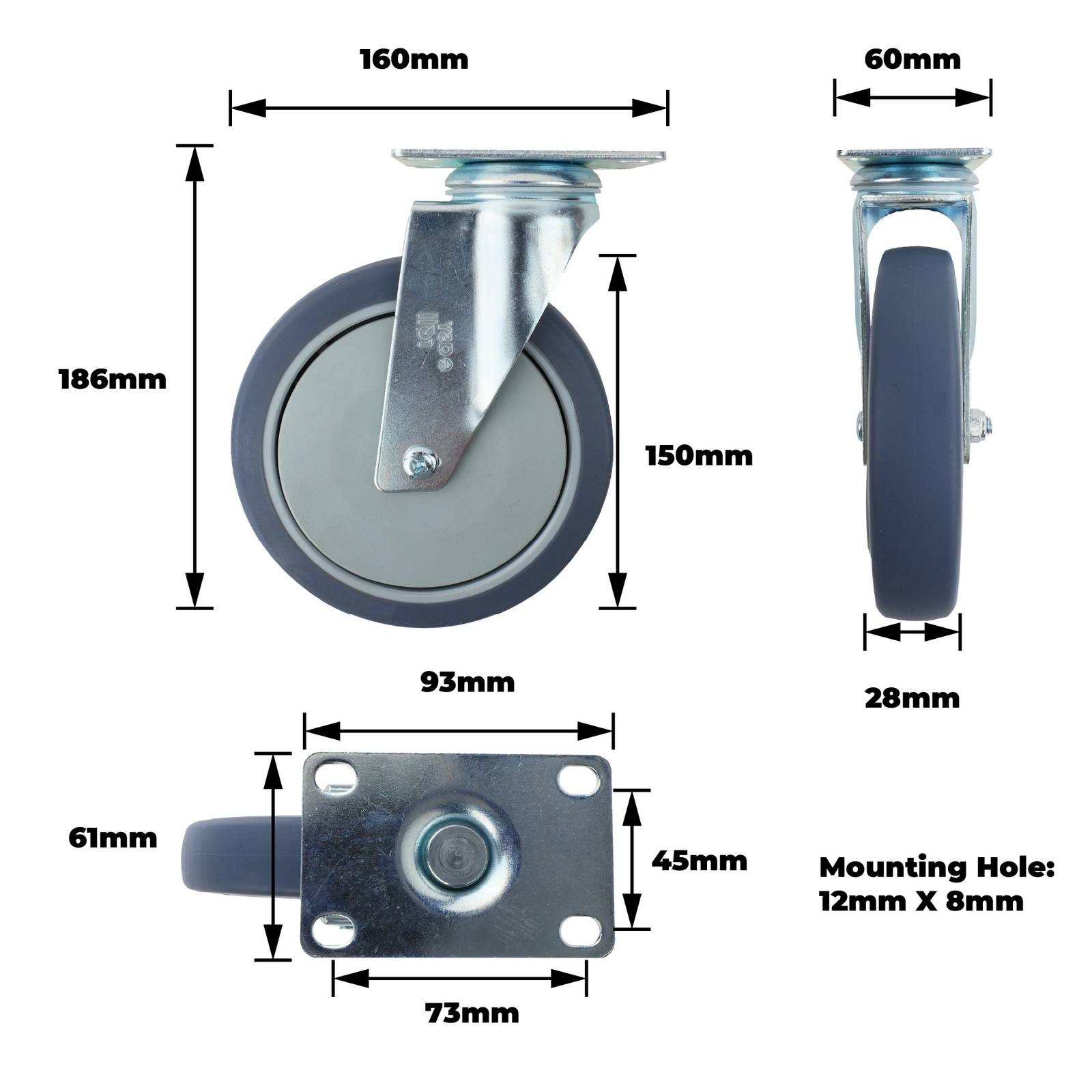 150MM GREY RUBBER SWIVEL PLATE: This swivel castor is built for DIY enthusiasts seeking reliable mobility for diverse applications. Crafted with a robust steel housing and precision ball bearings, it delivers smooth rotation and stable performance. The grey rubber component provides effective shock absorption and non-slip properties while the single raceway design optimises maintenance. Ideal for projects demanding durability, efficiency and practical technical solutions.Detailed