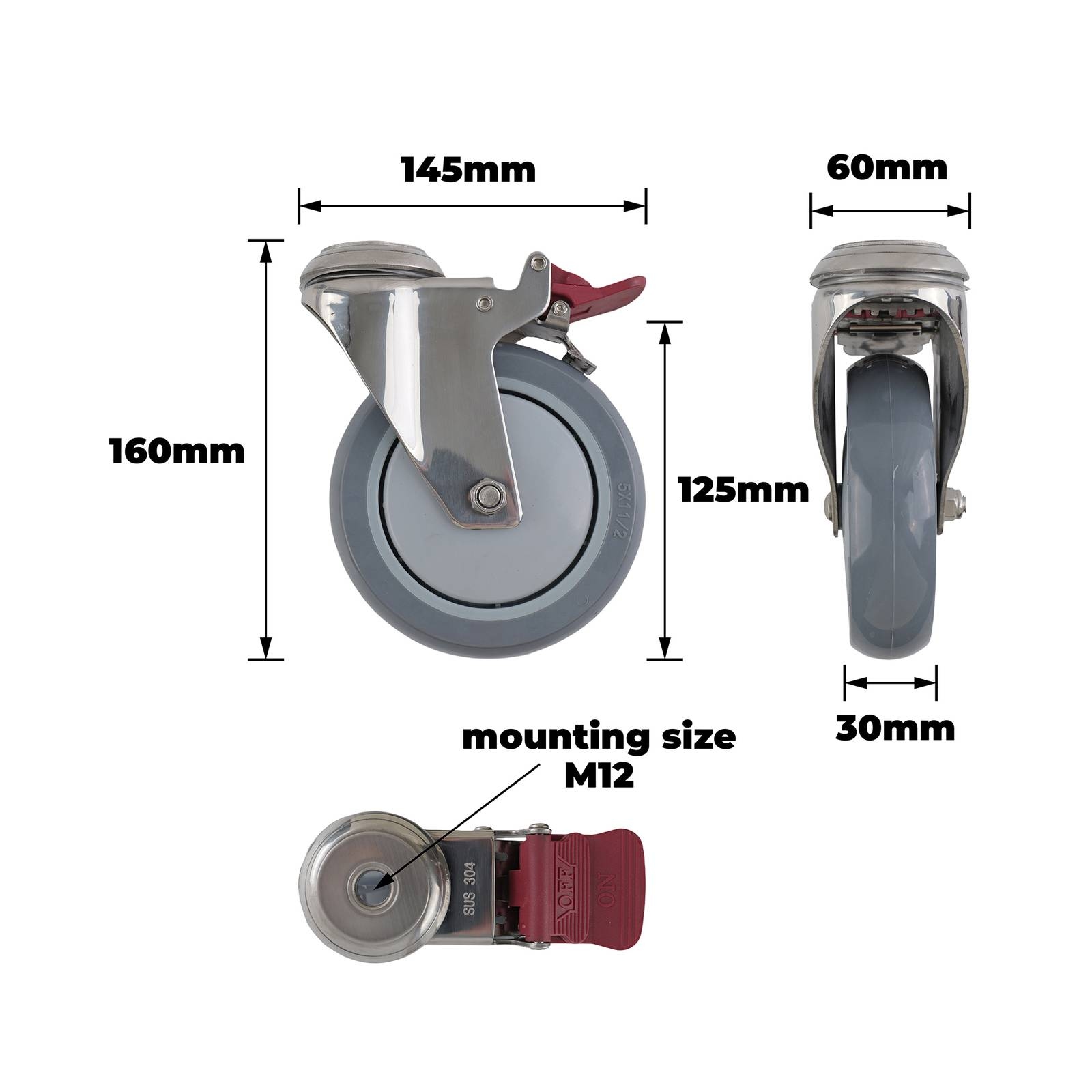 SS 125MM GREY URETHANE BOLT HOLE BRAKE CASTOR