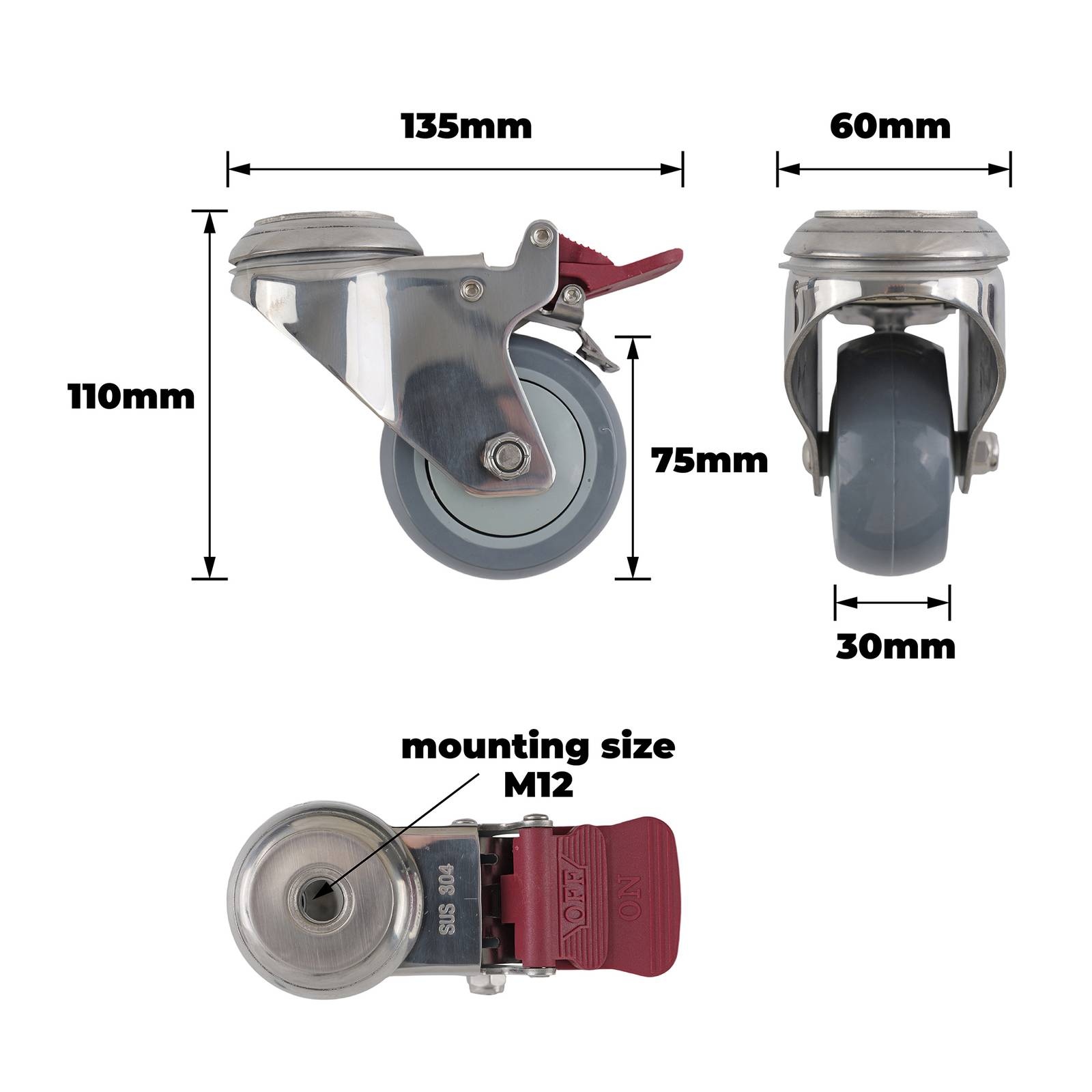 SS 75MM GREY URETHANE BOLT HOLE BRAKE CASTOR