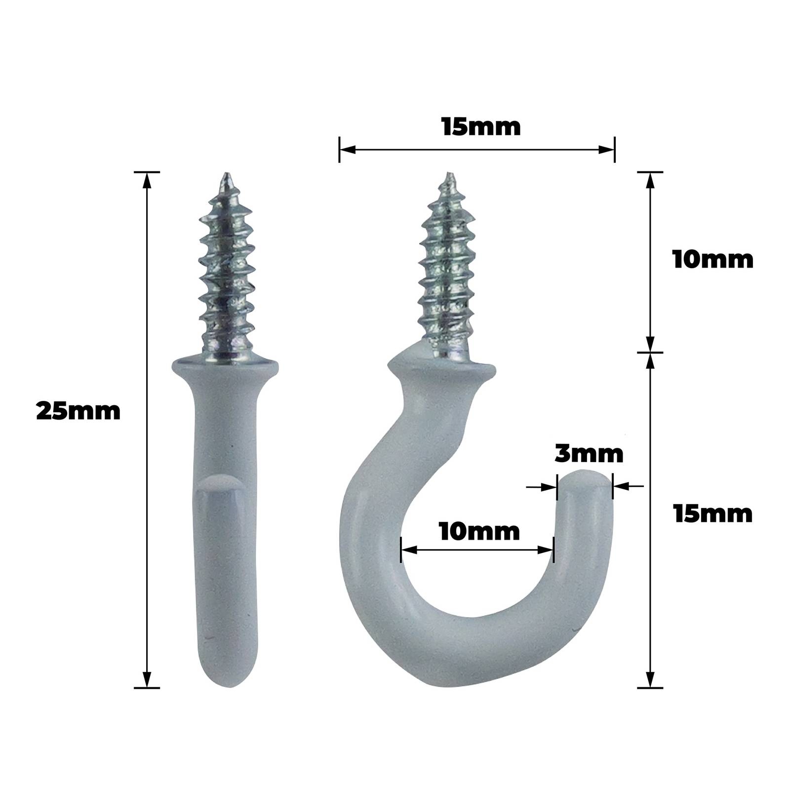 EVERHANG CUP HOOK 15 WHT PVC 25PCSThis product comprises durable cup hooks designed to support cups, utensils and other lightweight items in various settings. Manufactured from steel with a white zinc-plated finish, these cup hooks provide a practical solution for organising kitchens, workshops and DIY spaces. Their PVC component ensures ease of installation, and the pack of 25 offers a cost-effective option for secure hanging and storage applications.