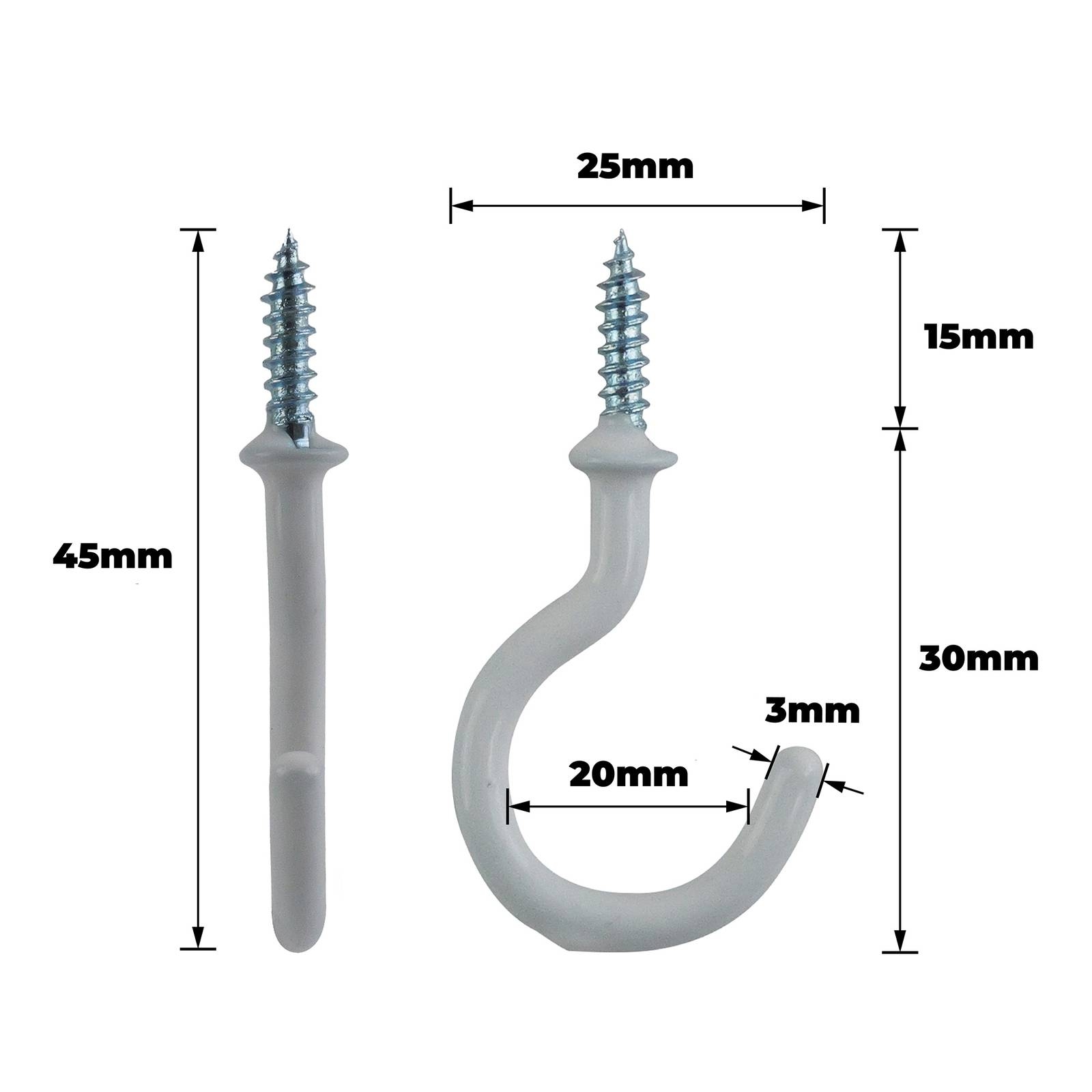 EVERHANG Cup Hook 32 WHT PVC 25PCS is a set of white cup hooks designed for a variety of DIY storage and organisational projects. Designed for practical application, these hooks are made from durable steel with a zinc-plated finish and PVC elements for secure installation. They offer a reliable solution for hanging cups, tools, or household items, making them a valuable addition to any home improvement project. Packaged in LDPE, this set provides efficient, hands-on utility for both retail and online markets.Detailed