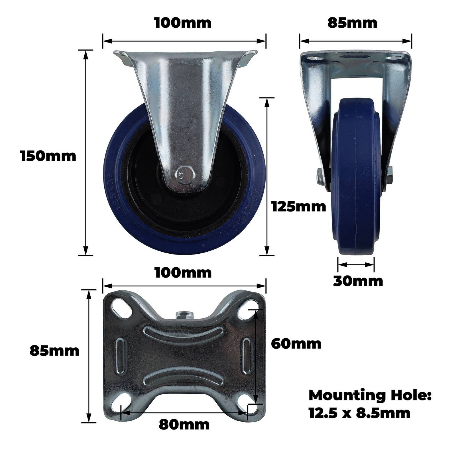 125MM BLUE ELASTIC RUBBER FIXED PLATE is a robust fixed castor component designed for heavy-duty DIY projects and industrial installations. Made with precision and a steel housing, it provides stability and durability even under demanding loads up to 150 kgs. The blue elastic rubber surface enhances vibration dampening and secure mounting, making it an ideal choice for retrofitting equipment in both retail and online applications.Detailed
