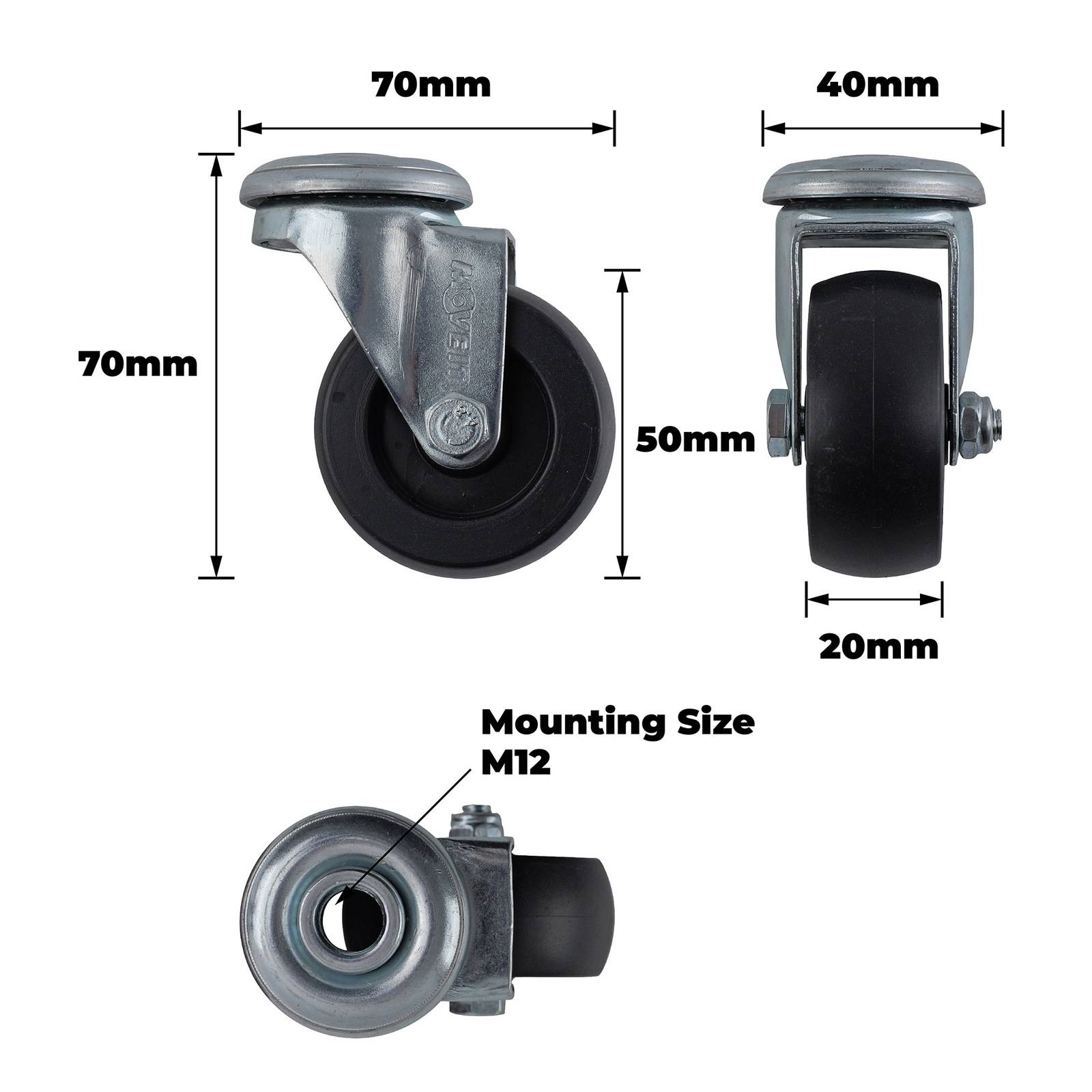 50MM BOLT HOLE SWIVEL CASTORThis swivel castor is designed for DIY projects and practical applications that require reliable movement and load support. Constructed from robust steel, it delivers durability and stability even under a 40 kg load. Its bolt hole design measuring 50 mm allows for secure attachment onto a standard M12 mounting base. The unit is ideal for workshop settings where precise technical performance and practical installation are valued.