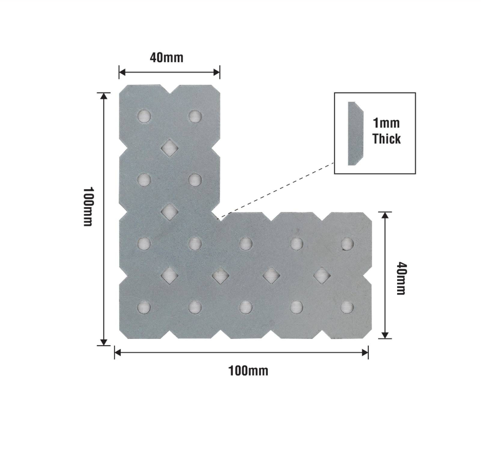 Carinya by RCR: MENDING PLATE MAB CARINYA++100X40X100X50X1MM L MABL05 is a steel mending plate with a zinc-plated finish designed for structural repairs and reinforcement. Engineered with precise dimensions, it provides a secure fit ideal for DIY enthusiasts seeking quality and reliability. This plate offers practical support in maintenance projects, ensuring effective reinforcement in diverse applications while delivering a robust and durable solution for everyday repair tasks.Detailed