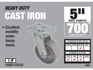 The Shepherd Hardware 5 inch swivel plate cast iron wheels have an exceptionally long wear life and can withstand temperature extremes. Recommended for infrequently moved objects on rough wood and concrete floors.