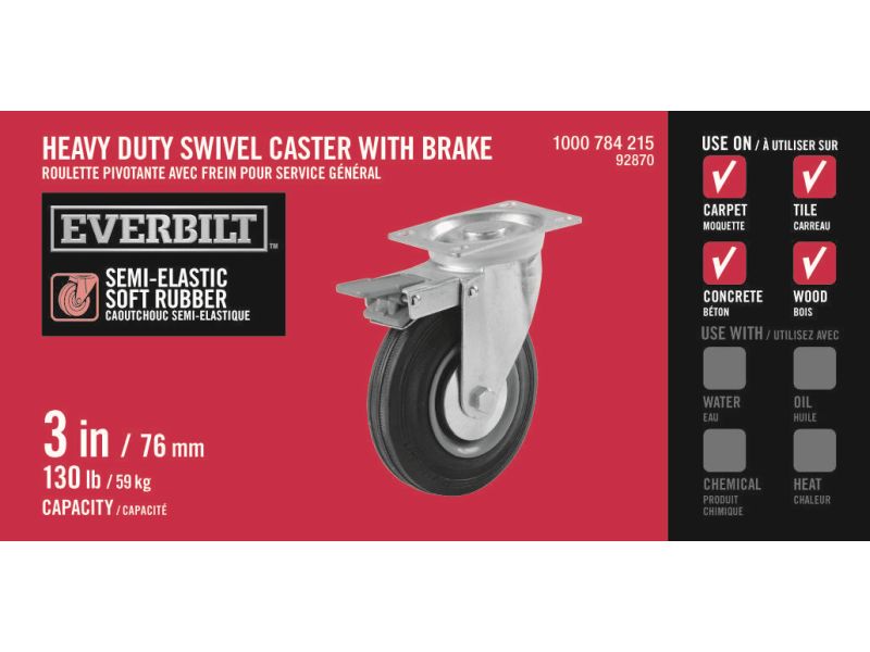 - * 3 inch diameter black semi-elastic soft rubber wheel with ball bearing swivel, plate mount, and Total Lock brake