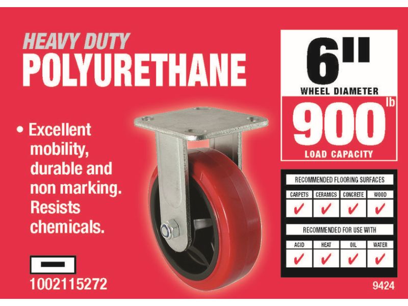 - * 6 inch diameter bright red polyurethane wheel over black polypropylene hub with rigid plate mount