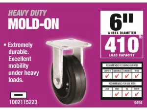 - * 6 inch diameter black rubber wheel over cast iron hub with rigid plate mount
