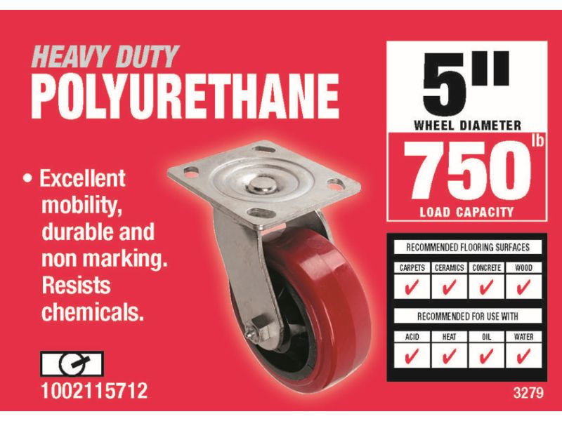 The Shepherd Hardware Polyurethane Casters are extremely durable under heavy use and load ratings. The distinctive red treads are chemically inert, non-sparking, non-conductive, impervious to ozone, grease and most oils & solvents, and will not mark floors. Shepherd model # 3279 features a 5 inch diameter wheel, 360-degree swivel plate, and a 750-lb load rating per caster.