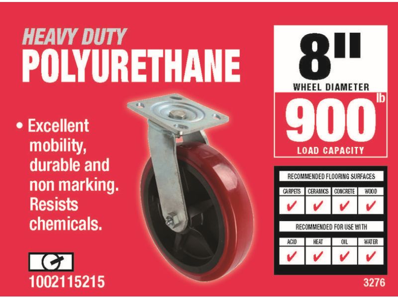 The Shepherd Hardware Polyurethane Casters are extremely durable under heavy use and load ratings. The distinctive red treads are chemically inert, non-sparking, non-conductive, impervious to ozone, grease and most oils & solvents, and will not mark floors. Shepherd model # 3276 features a 8 inch diameter wheel, 360-degree swivel plate, and a 900-lb load rating per caster.