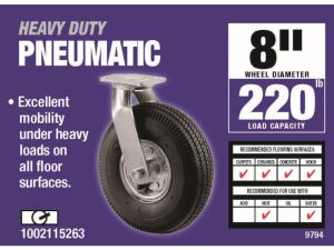 - * 8 inch diameter black rubber air-filled wheel on steel hub with ball bearing swivel and plate mount