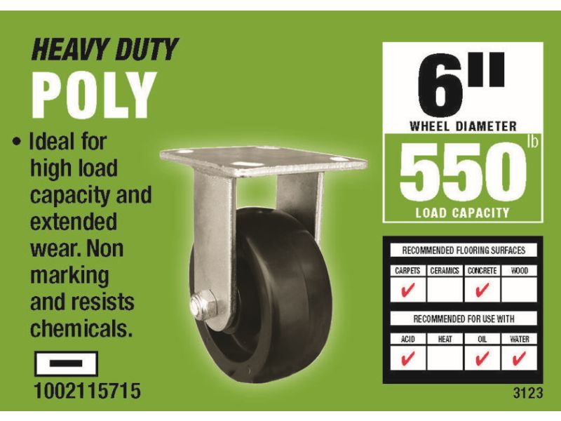 The Shepherd Hardware 6 inch polyolefin casters are ideal fopr high capacity and extended wear. Poly is extra heavy-duty yet non-marking with very good resistance to chemicals. A great caster for carpet and concrete floors, these will not develop flat spots on the wheel after periods of immobility while under load.