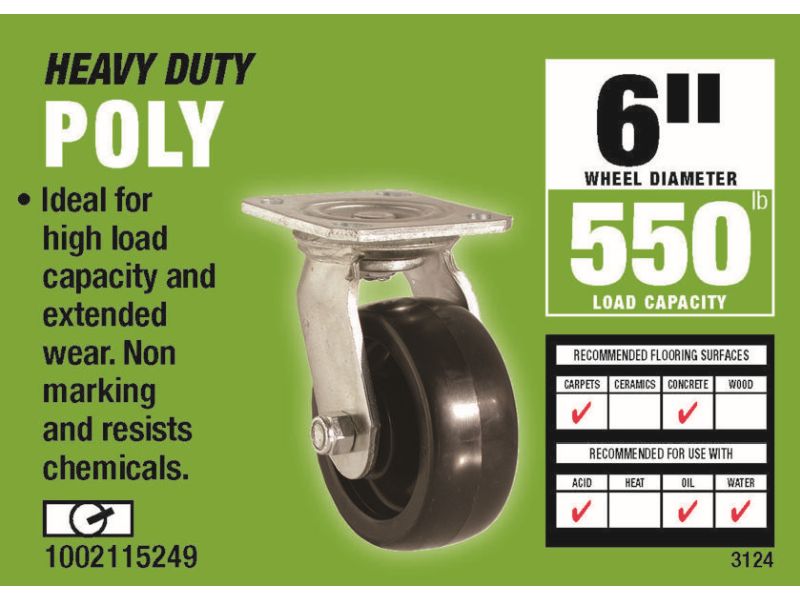 The Shepherd Hardware 6 inch polyolefin casters are ideal fopr high capacity and extended wear. Poly is extra heavy-duty yet non-marking with very good resistance to chemicals. A great caster for carpet and concrete floors, these will not develop flat spots on the wheel after periods of immobility while under load.