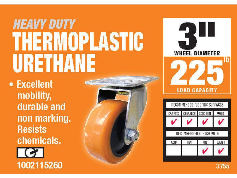 - 2 inch diameter bright orange thermoplastic urethane wheel over black polypropylene hub with ball bearing swivel and plate mount