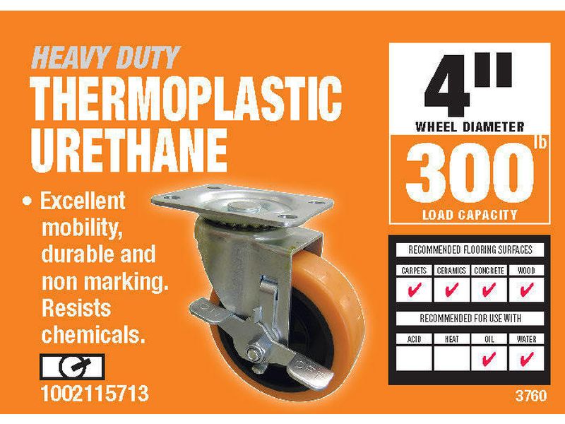 - 4 inch diameter bright orange thermoplastic urethane wheel over black polypropylene hub with ball bearing swivel, plate mount and side brake