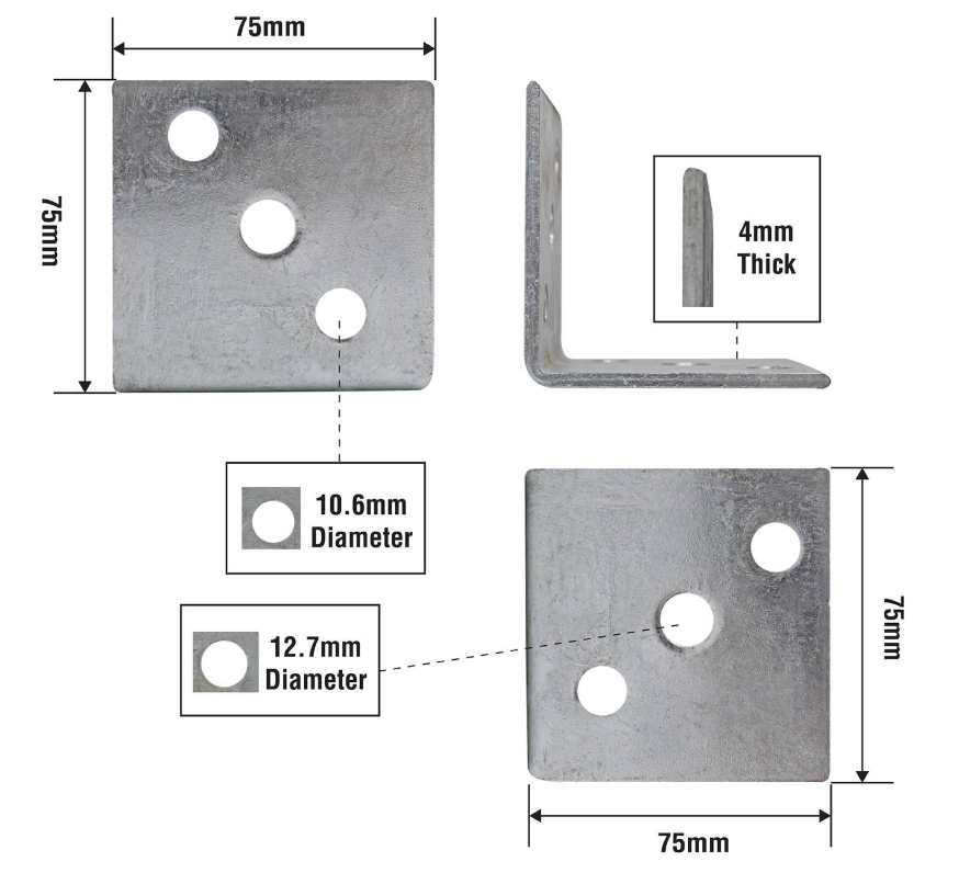 ANGLE BRACKET 75X75X75X4MM HDG is a heavy duty angle bracket made from robust steel with a hot dipped