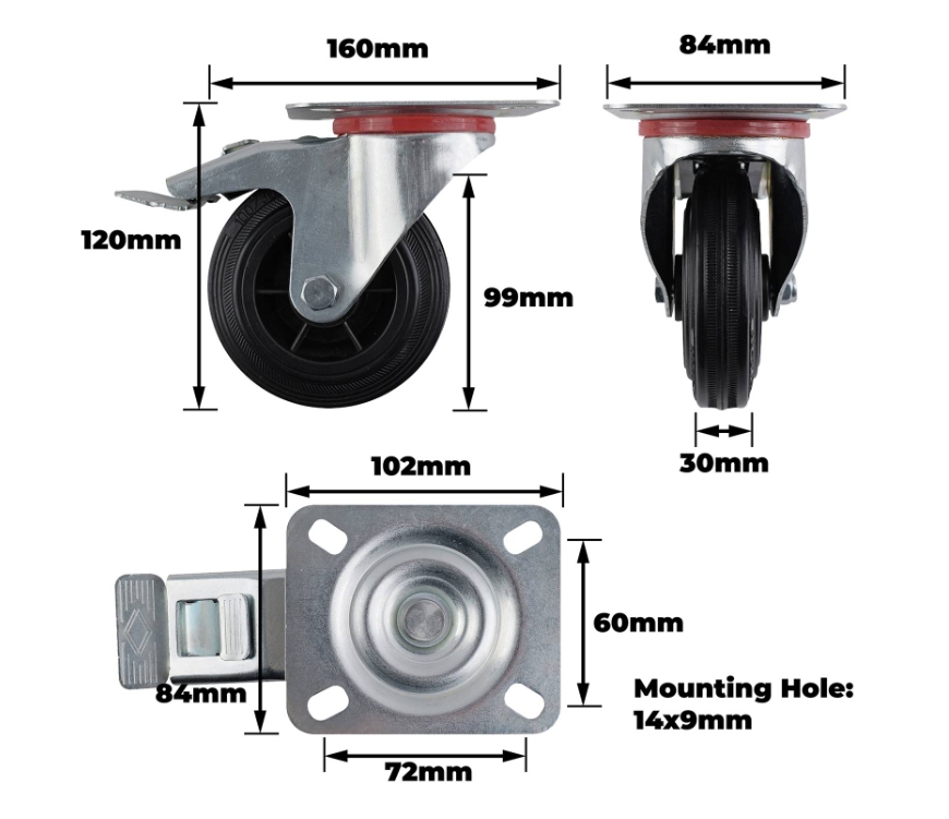 CASTOR SWIVEL PLATE WITH BRAKE D100 80KG is a robust casting solution designed for applications requiring high stability and controlled movement. Featuring a reinforced black rubber and plastic core, this castor efficiently accommodates loads up to 80 kilograms. Its plain bearing and single raceway design ensure smooth rotation while the steel housing and bearings offer durability under heavy-duty use. Ideal for DIY enthusiasts seeking reliable, technical components for industrial or home projects.详情说明