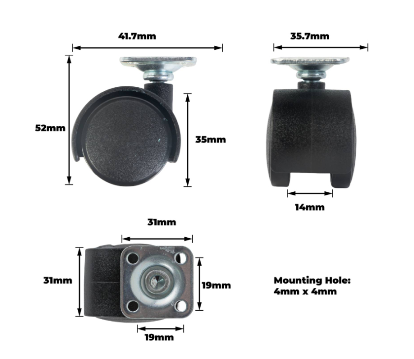 Black Polypropylene Swivel Castors – This product comprises a set of swivel castors featuring twin 35mm wheels with a zinc plated fixture rated at 30kg. Designed for DIY enthusiasts who value technical precision and practical functionality, these castors incorporate a plain bearing design and single raceway configuration to ensure smooth manoeuvring. Ideal for furniture repairs, equipment mobility and customised projects, they provide durable, reliable performance while being simple to install and maintain.详情说明