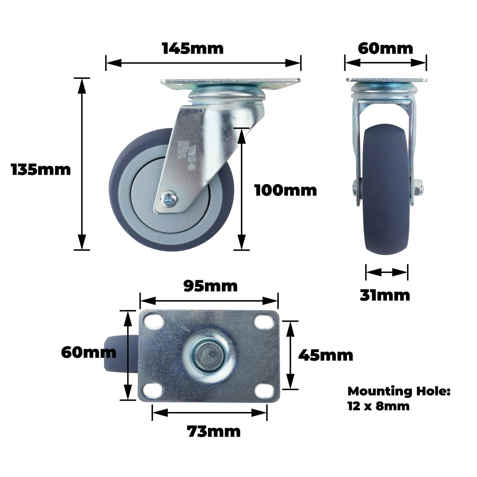 easyroll 100MM GREY RUBBER SWIVEL PLATE is a high-quality swivel castor designed for demanding DIY and industrial applications. This precision-engineered component allows for smooth manoeuvring while supporting tasks that require mobility and stability. Its robust construction, including a steel housing and thermoplastic rubber wheel, ensures long-lasting durability, making it ideal for equipment, furniture, and utility projects. Appreciated by DIY enthusiasts, it provides reliable performance with a load capacity of up to 120kg.详情说明