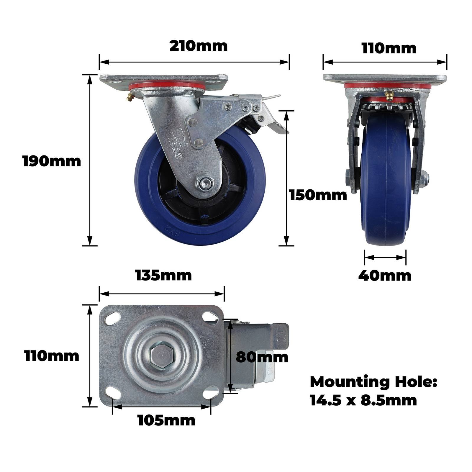 150MM BLUE ELASTIC RUBBER SWIVEL + BRAKE PLATE