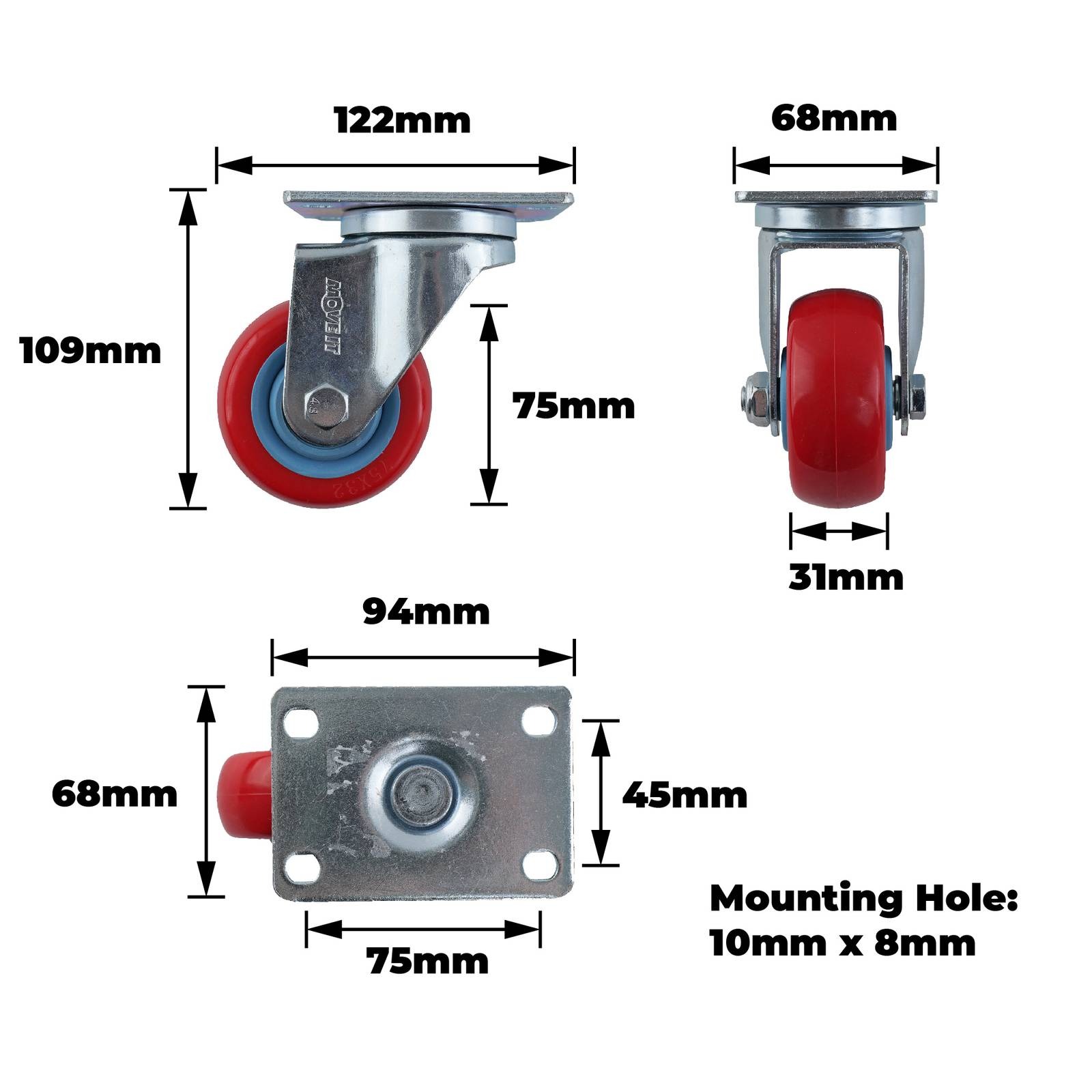 MOVE IT 75MM RED PU SWIVEL CASTOR is designed for durable, precise performance on everyday DIY projects and professional applications. Engineered with precision bearings and robust steel housing, this versatile castor supports load capacities up to 120kg while providing reliable, effortless manoeuvring. Its single raceway design, enhanced with a PP wheel core and PU tyre material, ensures longevity and consistent performance in demanding environments, making it a practical choice for workshop installations.详情说明