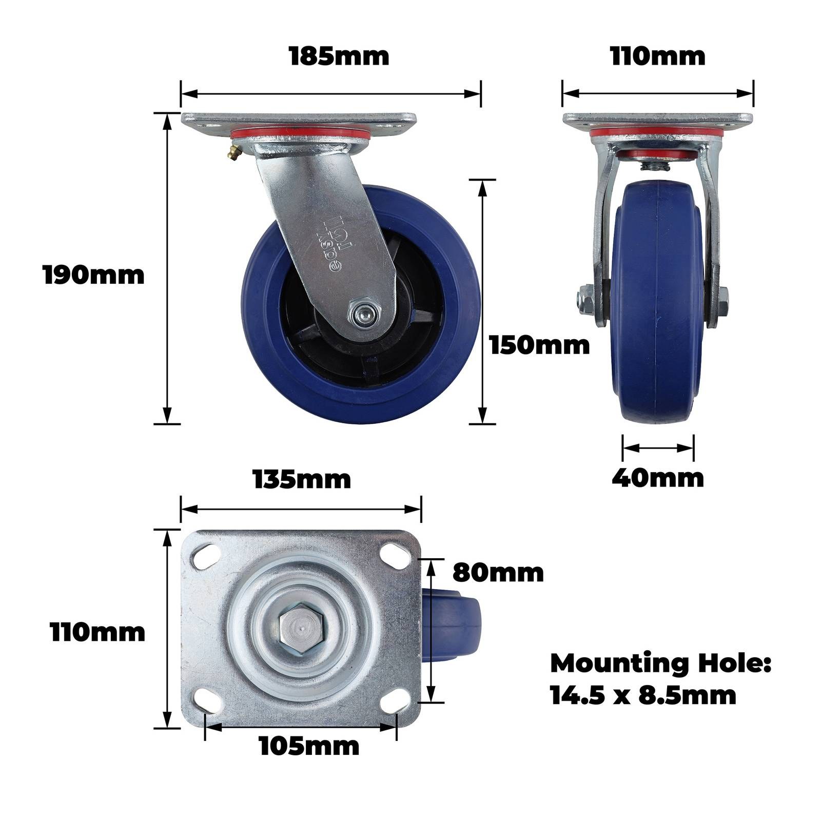150MM BLUE ELASTIC RUBBER SWIVEL 300KG is a robust swivel castor designed for demanding DIY applications. Featuring precision bearings and a durable steel housing, this castor is well suited for projects that require smooth manoeuvring and dependable load support. Its high load capacity of 300 kg and quality materials, including a PP wheel core and rubber tyre, ensure reliability and longevity in both retail and online DIY environments. Ideal for workshops and industrial settings.详情说明
