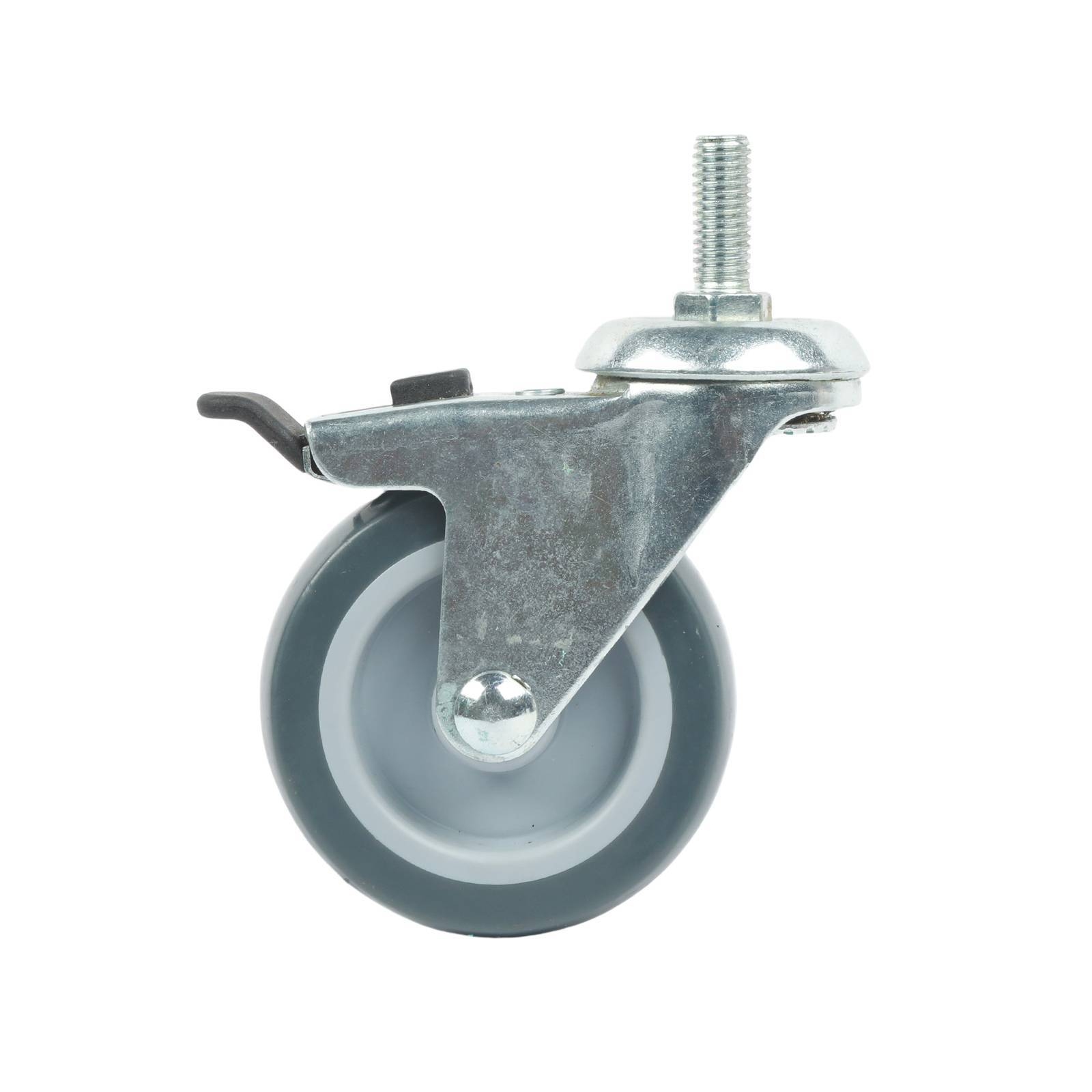 Grey PU swivel wheel 75mm, plain bearing, zinc plated, with brake, threaded stem size: M10x25mm, 60kg