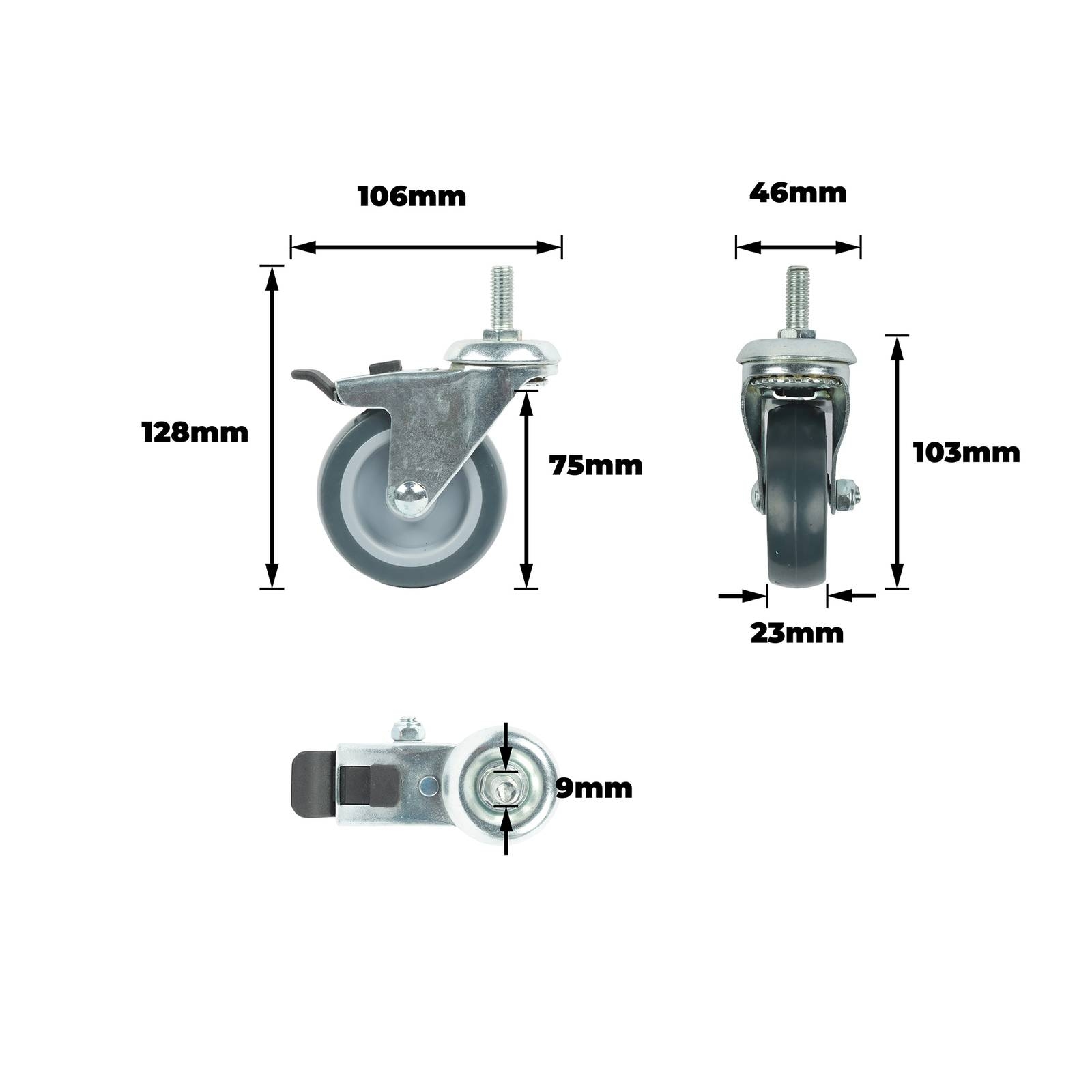 Grey PU swivel wheel 75mm with a plain bearing and brake is designed for DIY applications requiring reliable mobility and secure positioning. The zinc plated steel housing offers enhanced corrosion resistance, while the threaded stem (M10x25mm) facilitates straightforward installation. This caster is ideal for light to medium load requirements, making it a valuable addition to workshop and retail projects for those who need practical, technical solutions without unnecessary embellishments.详情说明