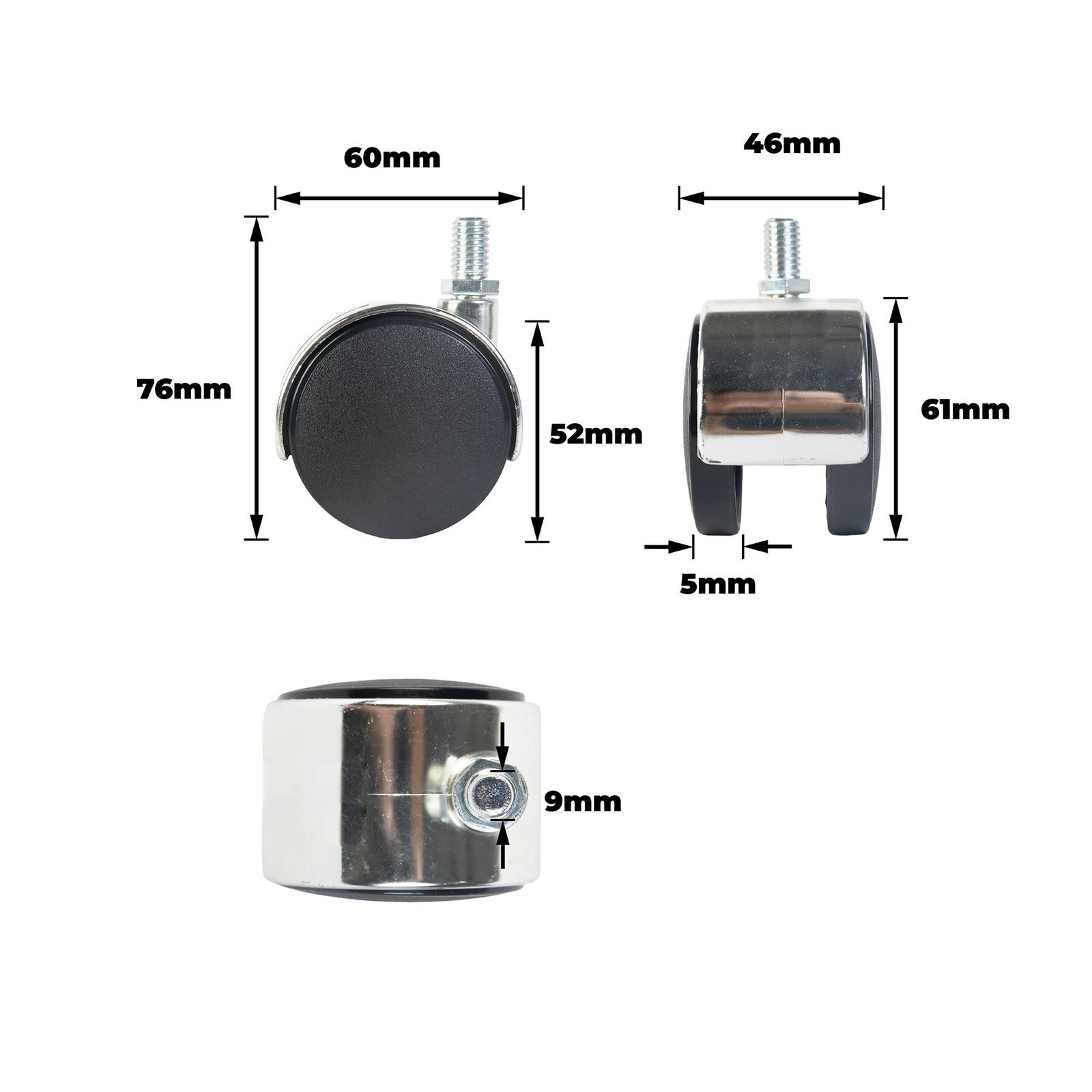 This swivel castor is designed for DIY projects that demand reliable manoeuvrability and sturdy load support. Constructed from a zinc alloy frame with chrome plating and featuring black polypropylene wheels, it delivers effective performance at a load capacity of 40kg. The plain bearing design paired with the dual raceway ensures smooth rotation, while the threaded M10x20mm stem provides secure mounting for various practical applications.详情说明