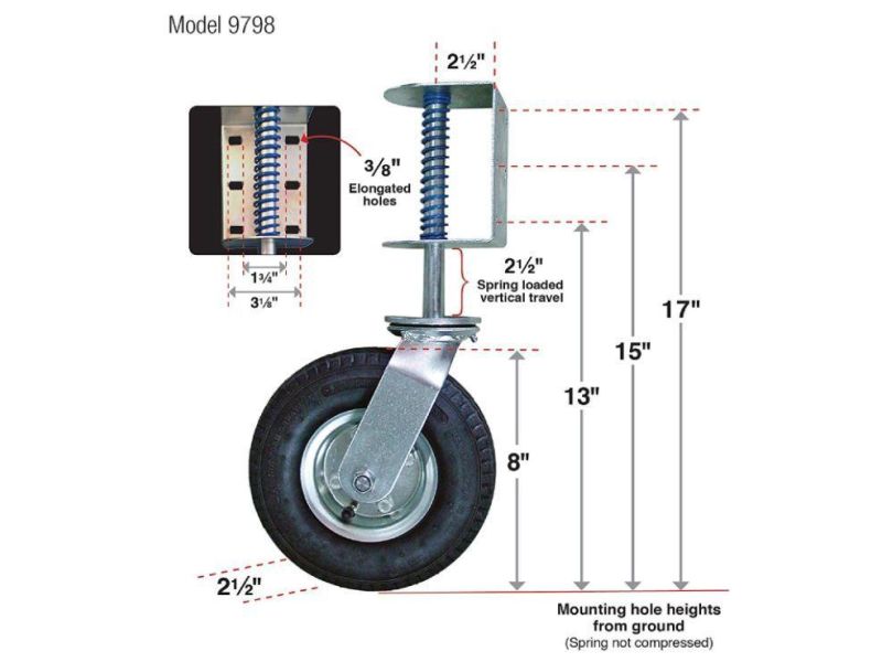 The Shepherd Hardware Pneumatic Gate Casters are designed to allow gates and fences to open and close easily. The 8-inch spring-loaded clamp acts as a shock absorber when the caster is rolling over rough or uneven surfacesand boasts a 200-lb load rating.